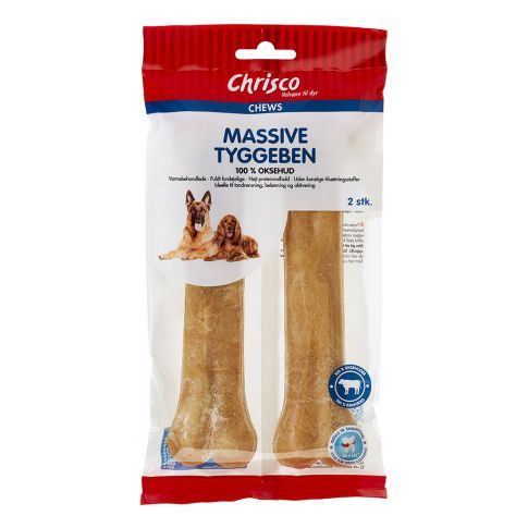 Chrisco Massive tyggeben, 2 stk. er mere end bare en lækker tyggeting for din hund. De er designet til at være et alsidigt produkt, der holder din hund beskæftiget, samtidig med at de hjælper med at pleje dens tænder. Uanset om du leder efter en sund belønning efter træning eller et redskab til at aktivere din hund, er disse tyggeben en fantastisk løsning. Husk dog, at produkter af oksehud ikke bør gives til hvalpe under 6 måneder.